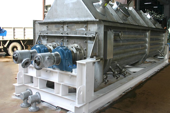 The disposal of sludge is becoming a grave issue for most of the organizations as even though almost 80% of the sludge is water; the organizations still have to pay the hauling costs by kg. These limitations of mechanical drying create a need for alternative treatments such as thermal drying. Our Sludge dryers work on the basis of indirect heat conduction via twin revolving hollow shafts welded with hollow paddles. The spiral paddle blade system breaks the sludge down while recirculating. Indirect heat application has the further benefit of more efficient temp control and heat transfer while avoiding burning or smoldering of sludge. Our dryers are designed in a very compact manner and can be fit directly under the filter press. They are unaffected by the sticky, adhesive or viscous nature of the sludge and require minimal maintenance.